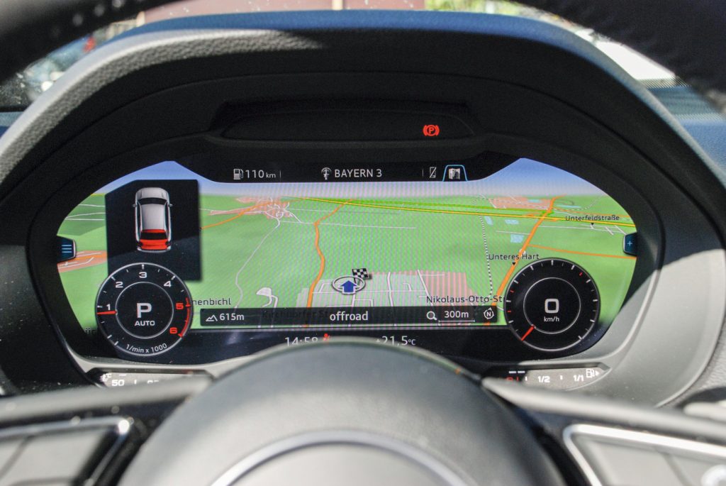 Ein Hingucker ist auch das Audi-Virtual- Cockpit, bei dem der Fahrer die Möglichkeit verschiedener Darstellungen hat. So kann zum Beispiel via Knopfdruck die Navikarte prominent im Virtual-Cockpit platziert werden, während Tacho und Drehzahlmesser minimiert an den Rändern angezeigt werden.