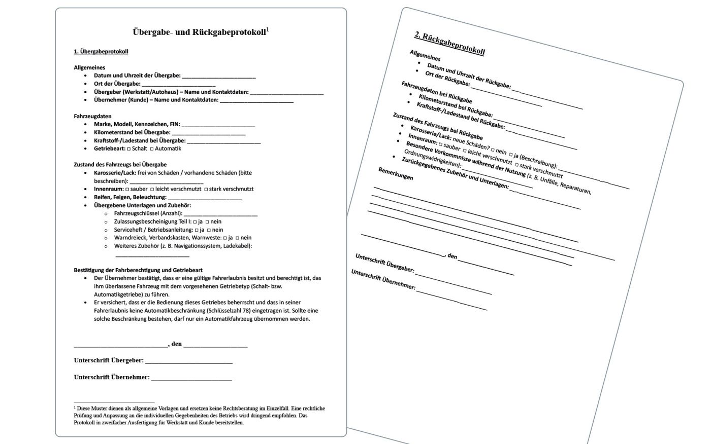 Zunächst gilt natürlich, dass die Werkstatt dem Kunden ein verkehrssicheres und technisch einwandfreies Auto überlässt. Deshalb sollte der Ersatzwagen vor jeder Herausgabe kurz gecheckt und dies auch dokumentiert werden. Zu einer anschließenden rechtssicheren Fahrzeugübergabe gehört ein Übergabeprotokoll (Muster siehe unten) beziehungsweise ein schriftlicher Ersatzwagenvertrag mit folgenden Punkten: