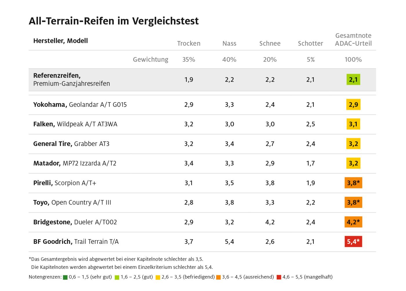Einen Sieger und einen eindeutigen Verlierer gibt es dennoch. Auf Platz eins rangiert der Yokohama Geolandar A/T G015. Wobei auch er mit seiner Gesamtnote 2,9 deutlich hinter dem Referenzreifen (Note 2,1) zurückbleibt. Am unteren Ende: Der BF Goodrich Trail Terrain T/A, der wegen eklatanter Schwächen bei Nässe mit „mangelhaft“ (5,4) abschneidet.