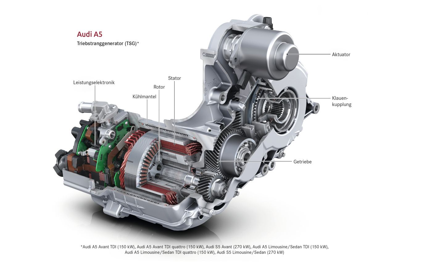 Dass die Plattform für Hybride ist, spiegelt sich auch im Namen wider: Combustion bedeutet Verbrennung. Bisher findet die Basis Verwendung bei A5- und Q5-Modellen mit Vier- und Sechszylindermotor und unterstützt sowohl Fronttriebler als auch Fahrzeuge mit Allrad. Das MHEV-System basiert auf Komponenten, die auf Effizienz und die Optimierung des Ladezustands (State of Charge SoC) des 48-Volt-Stromspeichers zielen.