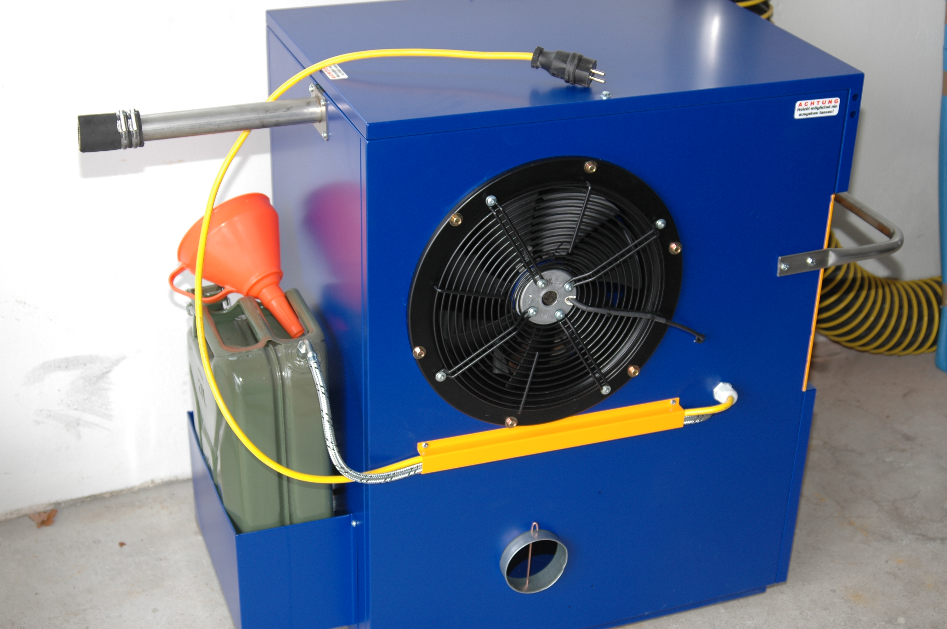 Wenn einmal der richtige Standort in der Werkstatt festgelegt ist, gestaltet sich das Aufstellen des steckerfertigen Heizgerätes anhand der ausführlichen Betriebsanleitung sehr einfach. Das Gerät muss immer am Boden des zu beheizenden Raumes stehen. Sollte der Ventilator zur Gebäudewand weisen, ist ein Mindestabstand vom Ventilator zur Wand von 300 mm einzuhalten. Das Gerät arbeitet nach dem Umluftprinzip, das heißt, die Raumluft erwärmt sich und wird im vorgewärmten Zustand vom Lüfter angesaugt und nochmals erwärmt wieder in den Werkstattraum geblasen. Somit erwärmen sich die Räumlichkeiten sehr schnell.