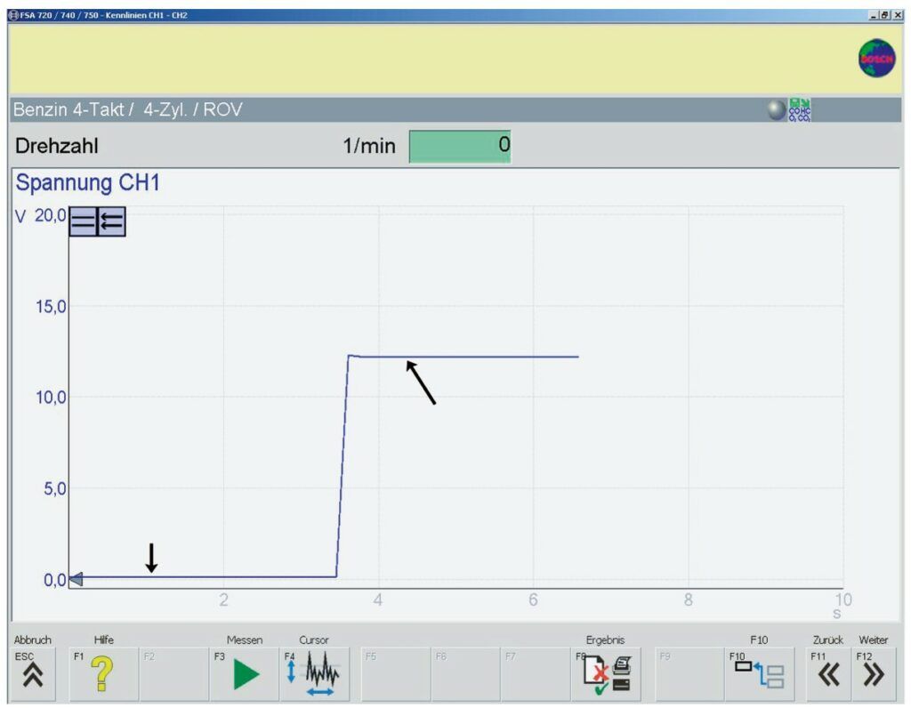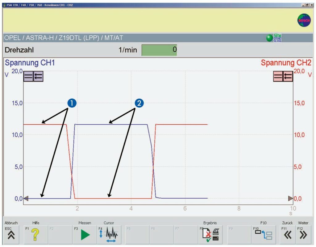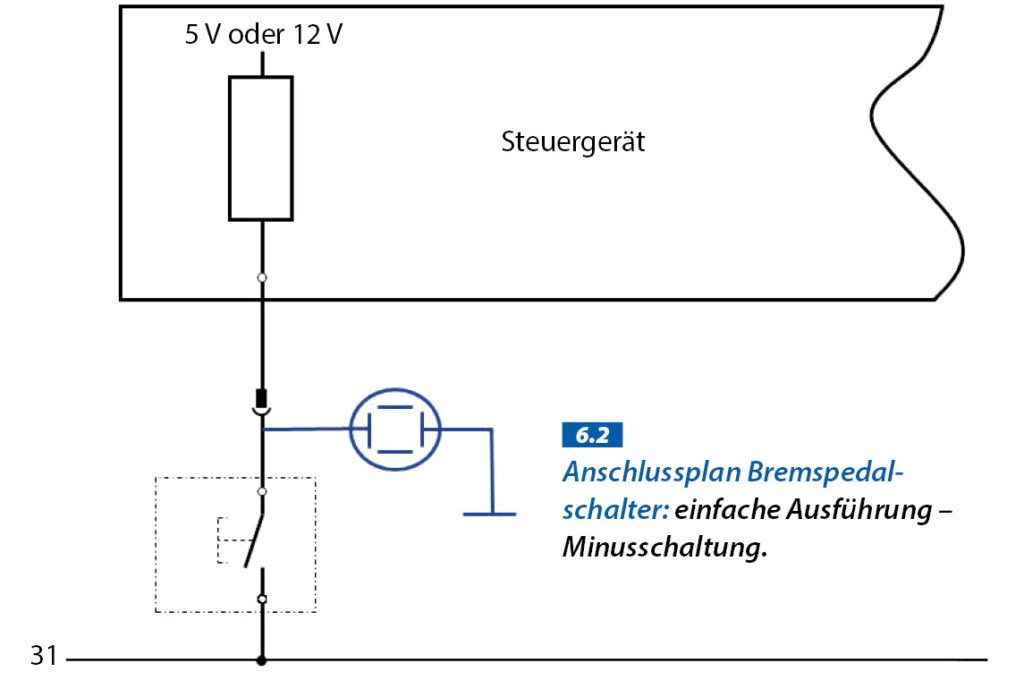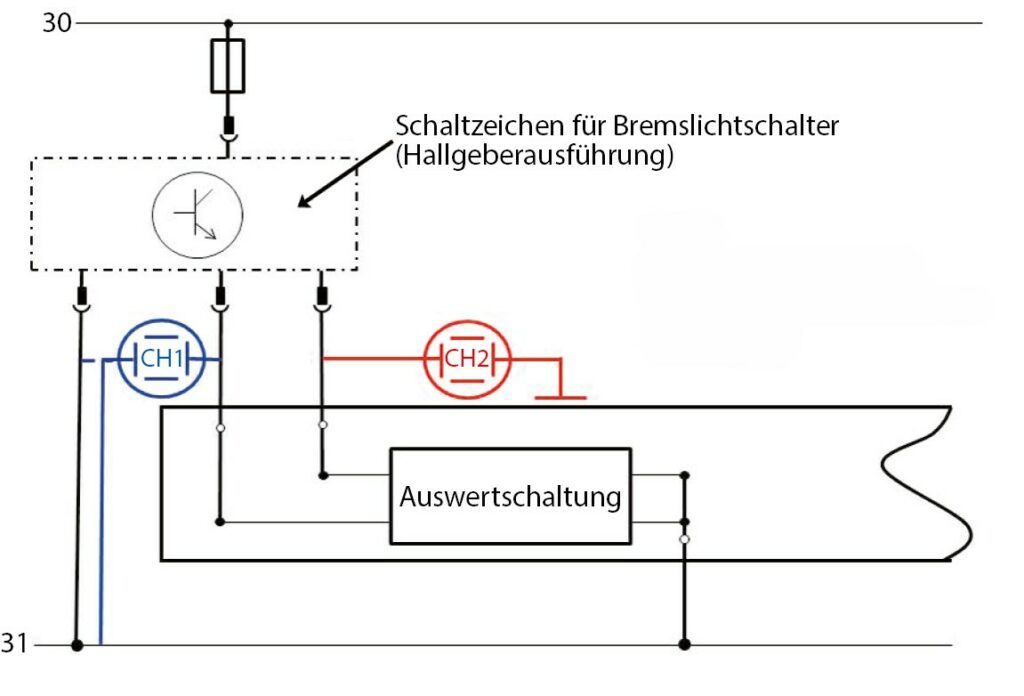 Der Kfz-Profi misst zuerst mit dem Oszilloskop auf der Signalleitung zwischen Steuergerät und Masse den Signalverlauf am Bremspedalschalter. Je nach Hersteller kann hier eine Plus- oder Masseschaltung vorliegen. Des Weiteren kann es sich bei den Schaltern um Öffner oder Schließer handeln.