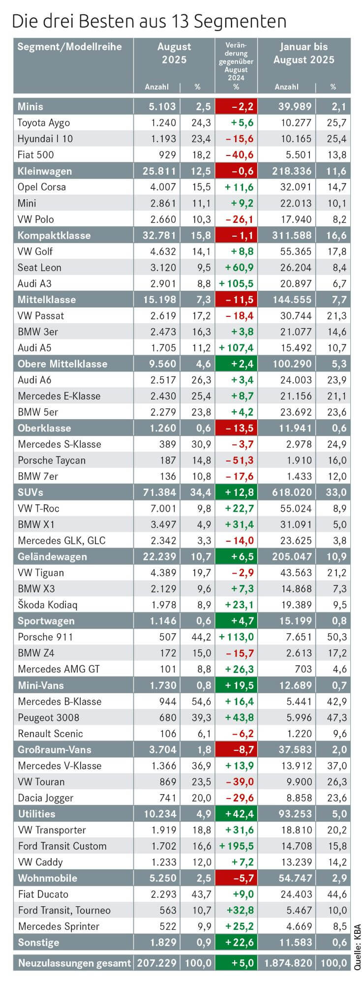 KBA-ZahlenDie drei besten aus 13 Segmenten Veröffentlicht am 11. September 2025 | von Christine WaldmannLesezeit: 1 Min.Kommentieren Bild: KrafthandDie aktuellen Zahlen zu den meistverkauften Pkw-Modellen in ihren Segmenten von August 2025 liegen vor.Bild: Krafthand, Quelle: KBAteilen teilen teilen drucken E-Mail Themen:KBANeuzulassungen