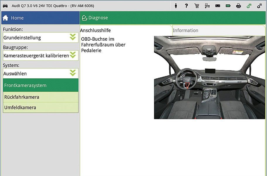 Zu Beginn der Kalibriermaßnahmen (Kalibriert wird in Bezug auf die geometrische Fahrachse) verbindet der Kfz-Profi das Diagnosegerät über die OBD-Schnittstelle mit dem Fahrzeug. Über das Hauptmenü wählt er unter der Rubrik Diagnose > Grundeinstellungen das zu kalibrierende System, in diesem Fall die Frontkamera aus. Das Diagnosegerät beschreibt zunächst die genauen modellspezifischen Voraussetzungen, die der Techniker abarbeiten muss. Die notwendigen Arbeitsschritte werden ebenfalls beschrieben.