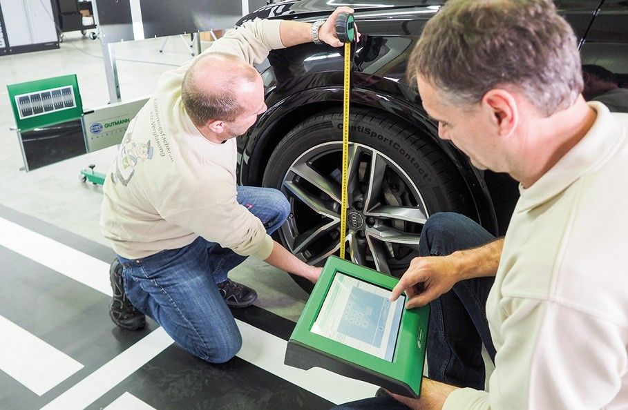 Die Höhe der Karosserie wird von der Radlaufunterkante über die Radnabe zum Boden erfasst und ins Diagnosegerät eingegeben. Bild: Manfred Rudhart