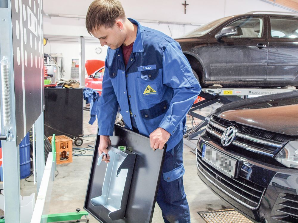 Der CSC-Tool-Grundträger mit der fahrzeugspezifischen Kalibriertafel wird im vorgegebenen Abstand vor dem Fahrzeug positioniert. Bild: Manfred Rudhart