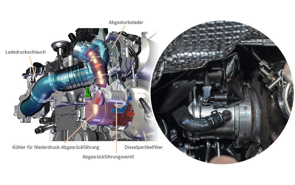 Die Abgasrückführung dient natürlich wie das SCR-System dazu, den Stickoxidausstoß zu minimieren. Allerdings wirkt diese nicht im Nachgang, sondern vorbeugend. Sprich, durch die zurückgeführte Luft sinkt der Sauerstoffanteil im Verbrennungsraum und es entsteht schon im Motor weniger NOX. Um dies zu optimieren, verfügen moderne Motoren wie der EA 288 über eine Hochdruck(HD)- und eine Niederdruck(ND)-AGR.