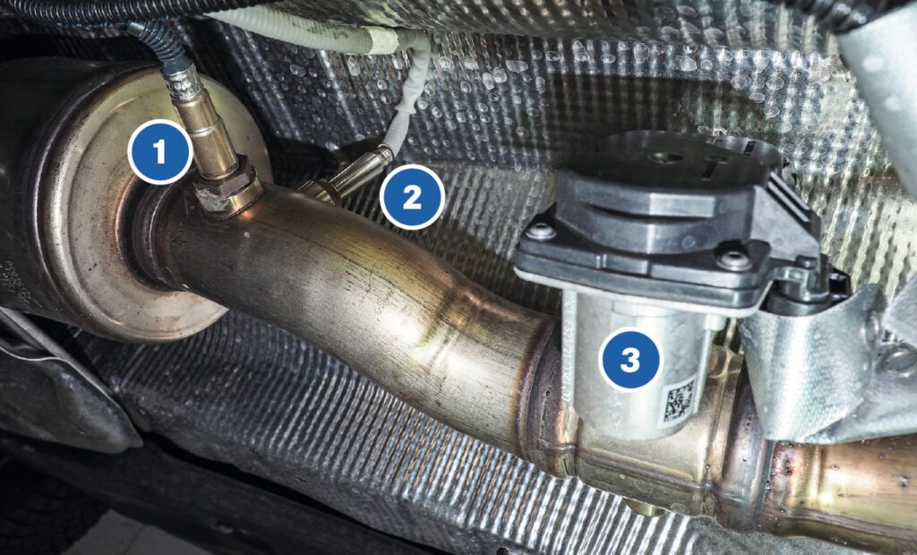 Neu hingegen ist, dass Fahrzeuge mit diesem Triebwerk über gleich zwei SCR-Katalysatoren verfügen – im unterschiedlichen Abstand zum Turbolader montiert (Bild 1).