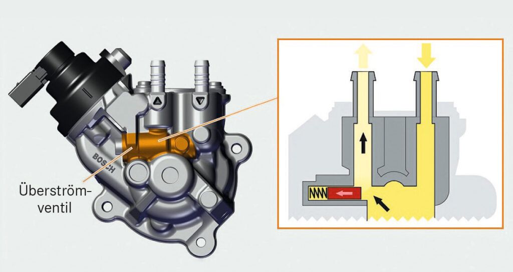 Auch wenn in den technischen Daten für den Dieselvorlauf das genannte Druckfenster angegeben ist, im Normalfall liegt der Zulaufdruck zur Hochdruckpumpe bei maximal 4,3 bar, da das Überströmventil an der Hochdruckpumpe beim Überschreiten dieses Werts eine Verbindung zwischen Vor- und Rücklauf zum Druckabbau freigibt (Bild 4 in nachfolgender Bildergalerie nach Abo-Schranke).