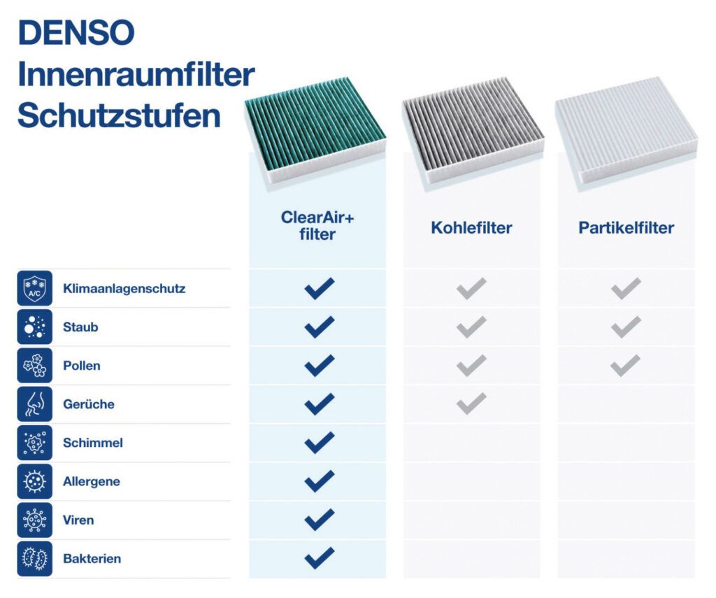 Die neue Filtergeneration ClearAir+ von Denso enthält einen ISO-zertifizierten antibakteriellen und antiviralen Schutz in einem fünfstufigen System. Mit 45 Teilenummern deckt die Reihe über 150 Millionen Fahrzeuge in Europa und rund 33 Millionen Fahrzeuge im DACH-Raum ab – darunter zahlreiche gängige OE-Referenzen, so der Anbieter.