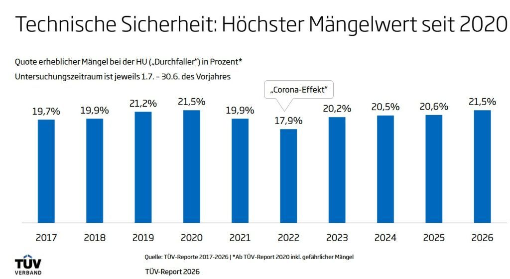 Beim Blick auf die Ergebnisse des TÜV-Reports 2026 zeigt sich als Negativtrend, dass die Mängelquoten im Pkw-Bestand zum vierten Mal in Folge gestiegen sind. So fallen 21,5 Prozent der bei den verschiedenen TÜV-Organisationen zur HU vorgefahrenen Fahrzeuge mit „gefährlichen“ oder „erheblichen Mängeln“ (EM-Quote) durch. Das ist ein Anstieg um 0,9 Prozent im Vergleich zum Vorjahr. Dazu kommen 12,3 Prozent Autos mit „geringen Mängeln“ (plus 0,8 Punkte). Vollkommen „mängelfrei“ waren nur 66,1 Prozent. Damit ist der Anteil der Fahrzeuge ohne Mängel so niedrig wie seit neun Jahren nicht mehr.