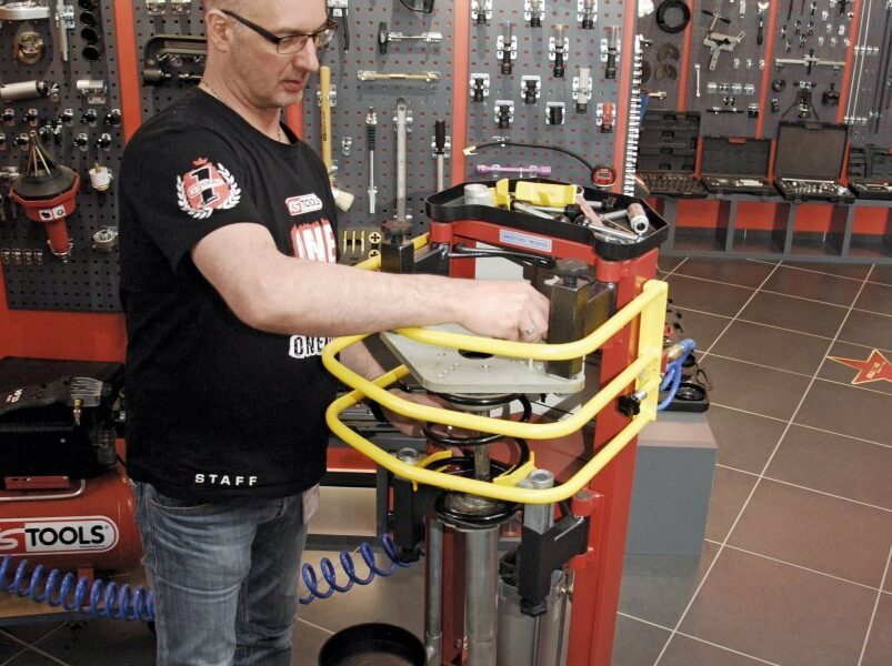 KS Tools hat eine Druckluft- Federspanner-Station im Programm, die den Wechsel von Feder- und Dämpferbeinen wesentlich erleichtern soll. Der Werkzeugspezialist gibt zudem an, dass dieses System das erhöhte Gefahrenpotenzial mancher Federarten durch verschiedene Sicherheitsmaßnahmen deutlich senkt.