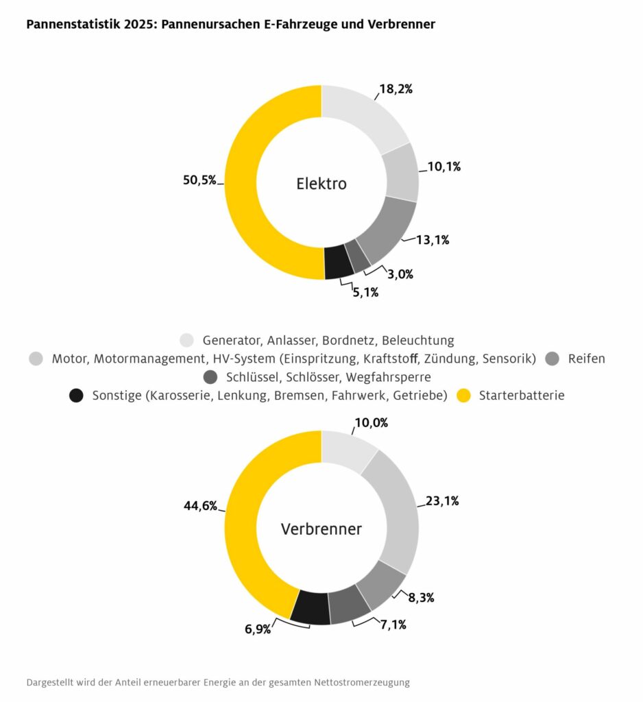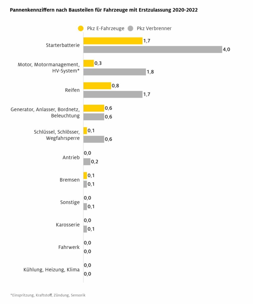 Die Hauptursache wie bereits in den Vorjahren: eine defekte Starterbatterie (44,9 %). Verbrenner sind hier anfälliger als Stromer. Zwar ist der Anteil der Starterbatterie am Pannenaufkommen bei E-Autos mit 50,5 Prozent höher als beim Verbrenner (44,6 %), allerdings liegt die Pannenkennziffer bei zwei- bis vierjährigen Verbrennern im Vergleich zu Stromern desselben Alters um 2,3 Pannen pro 1.000 Fahrzeuge höher. Grund ist die insgesamt geringere Pannenanfälligkeit der E-Autos gepaart mit einem geringeren Auftreten anderer Bauteilpannen.