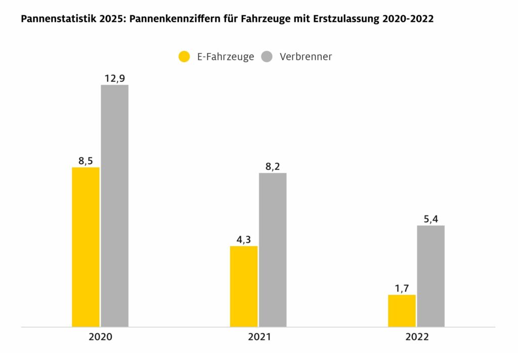 Laut dem Automobilclub stieg die Pannenanzahl bei E-Autos aufgrund der wachsenden Bestandszahl um 46 Prozent. Hier zeigt sich jedoch, dass Stromer insgesamt weniger anfällig sind als Verbrenner gleicher Altersklassen.