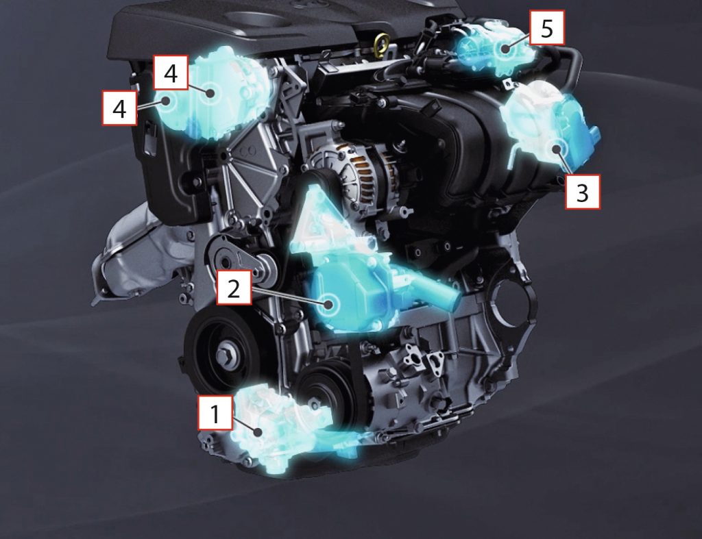 Bei der Steigerung des Wirkungsgrads tragen natürlich auch die variablen Regelungen einiger Systemkomponenten einen großen Anteil. Beispielsweise haben die geregelte Ölpumpe (1) und die Wasserpumpe (2) einen elektrischen Antrieb. Somit lassen sich die Fördermengen und der Förderzeitpunkt frei bestimmen. Ebenfalls variabel gesteuert ist die elektronische Drosselklappe (3), die Betätigung der Ein- und Auslassventile (4) und die AGR-Regelung (5). Die Möglichkeiten verschiedene Komponenten variabel steuern zu können, ist somit ebenfalls ein wichtiger Schritt, um moderne Verbrennungsmotoren bezüglich Wirkungsgrad und Verbrauch weiter optimieren zu können.