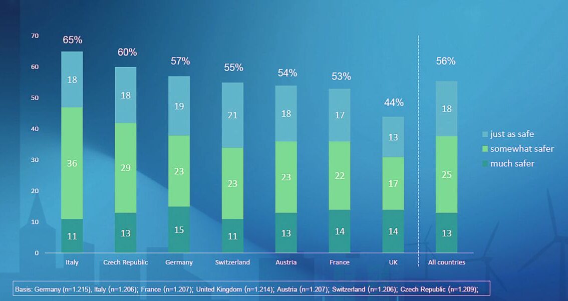 Ergebnisse aus Italien, Tschechien, Deutschland, Schweiz, Österreich, Frankreich und dem Vereinigten Königreich (v. l.) auf die Frage: „Wie beurteilen Sie die Sicherheit von automatisierten Fahrzeugen im Vergleich zu von Menschen gesteuerten Fahrzeugen?“ Bild: Allianz Versicherung