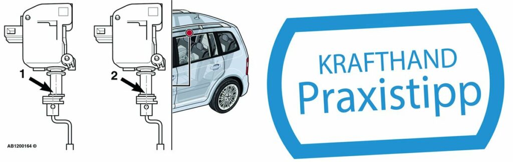 Im nächsten Schritt muss der Mechatroniker die Ausrichtung der Führungshülse für die Tankklappen-Stellgliedstange kontrollieren (siehe Punkt 1). Passt diese nicht, muss er die Befestigungsschrauben des Tankklappen-Stellglieds lösen und dieses zusammen mit der Führungshülse für die Stellgliedstange neu ausrichten (siehe Punkt 2). Nach dem Festziehen der Befestigungsschrauben ist die Tankklappe auf einwandfreie Funktion zu prüfen, um dann die Verkleidung wieder anzubringen.