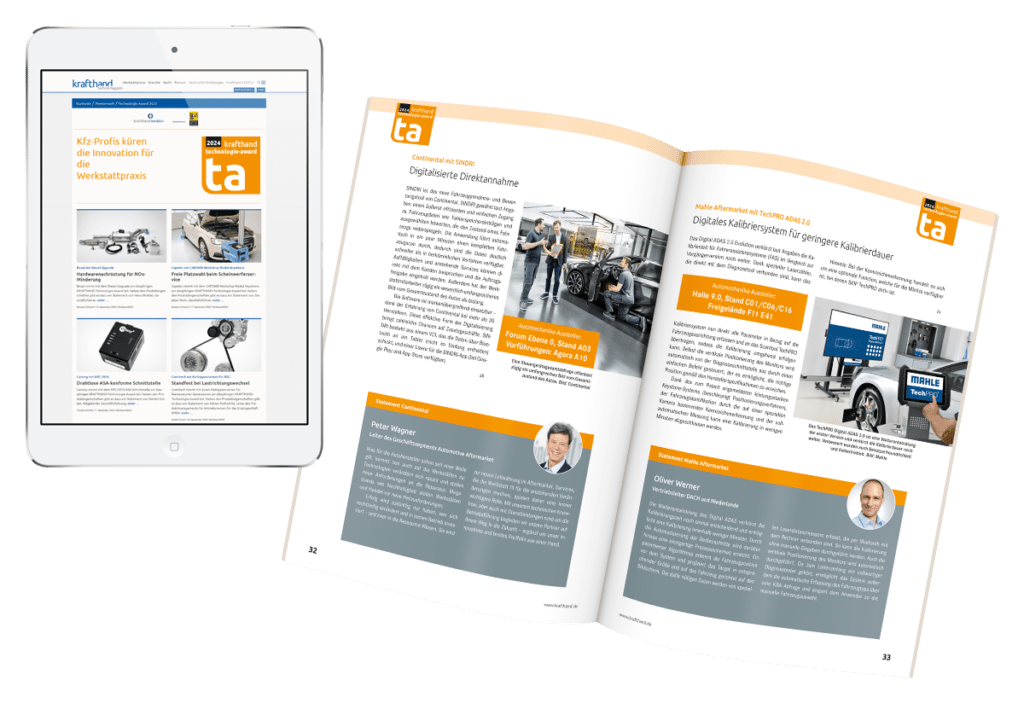 Die Kfz-Branche wandelt sich schnell. Folglich stehen die Leser der Krafthand in ihrem Werkstattalltag Jahr für Jahr vor neuen Herausforderungen, die sie mit entsprechendem Know-how, dem richtigen Equipment, geeigneten Teilen und praktischen Dienstleistungen bewältigen müssen. Werkstattausrüster, Teilezulieferer und -aufbereiter sowie Dienstleister können beim Krafthand-Technologie-Award 2024 zeigen, welche Innovationen sie neu am Start haben und mit welchen bewährten Produkten sie den Alltag in Werkstätten erleichtern.
