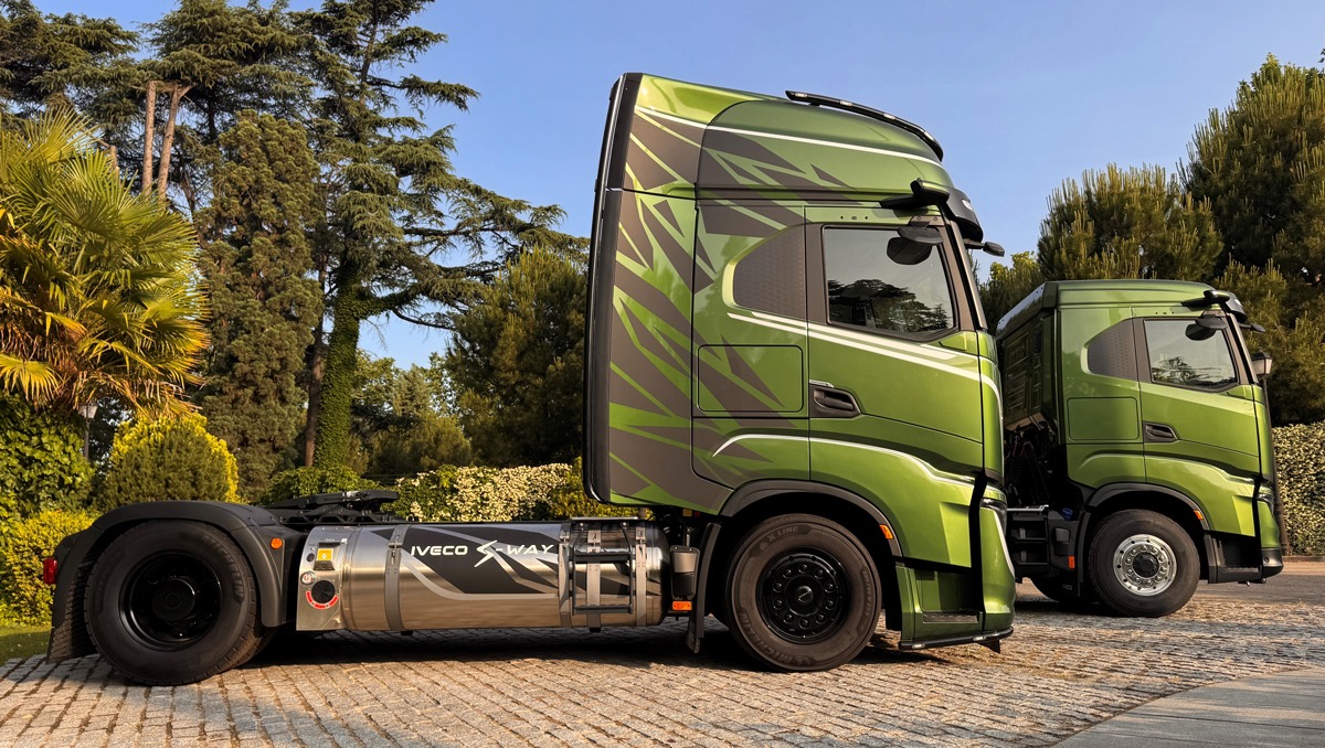 Einer der Lkw, der die Produktionshallen in Madrid verlässt, ist der neue IVECO S-Way in unterschiedlichsten Varianten. Das Fahrzeug kommt mit zahlreichen Neuerungen daher. So wird der neue XCursor 13 Motor von FPT Industrial verbaut. Er sorgt laut IVECO durch verschiedene innermotorische Maßnahmen für einen um zehn Prozent verringerten Kraftstoffverbrauch im Vergleich zum Vorgängermodell. Maximal leistet der Sechszylinder-Reihenmotor 580 PS bei 2.800 Nm. Die optimierte Luftzufuhr des XC-13 ermöglicht mit Hilfe eines elektronisch gesteuerten EVGT-Turboladers ein ‚Downspeeding‘. Das bedeutet, die Motordrehzahl kann bei gleicher Leistung reduziert werden, was den Kraftstoffverbrauch senkt, das Ansprechverhalten und die Verbrennungseffizienz verbessert. Tatsächlich konnte man das bei den Probefahrten im Hinterland von Madrid persönlich erfahren – Laufruhe und richtig ‚Durchzug‘ von unten. Dabei handelt es sich beim XC13 um einen Multifuel-Motor, der neben Diesel mit CNG, LNG, HVO100 und mit geringen Anpassungen, auch mit Wasserstoff betrieben werden kann.