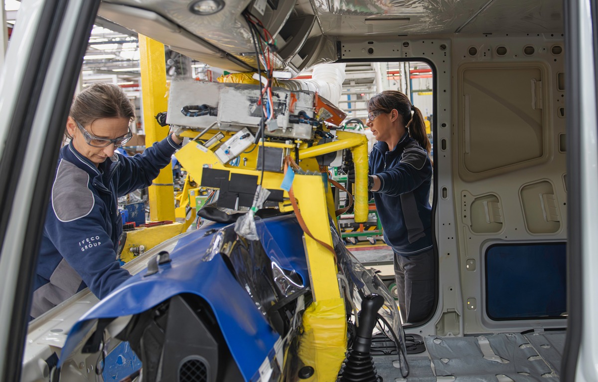 Moderne Produktionsabläufe im Lkw-Bau sind digitalisiert und auf Effizienz, Flexibilität sowie Nachhaltigkeit ausgerichtet. Die Automatisierungsgrad ist jedoch längst nicht so hoch wie im Pkw-Bereich. So wird bei IVECO in Madrid auch verhältnismäßig viel Hand angelegt. Dennoch stellt sich die Produktion aufgrund der hohen Fahrzeugvarianz komplex dar. So wird nur durchschnittlich jede 3,2 Jahre exakt das gleiche Fahrzeug gebaut. In Zahlen ausgedrückt: In Madrid werden neun Baureihen, 267 unterschiedliche Modelle mit 2.648 Einzeloptionen hergestellt. Das ergibt 41.524 Varianten. Dabei verbaut man pro Fahrzeug rund 30.470 Einzelteile. Dabei ist jedes größere Bauteil, jede angelieferte Baugruppe über QR- oder RFID-Codes rückverfolgbar (Traceability).
