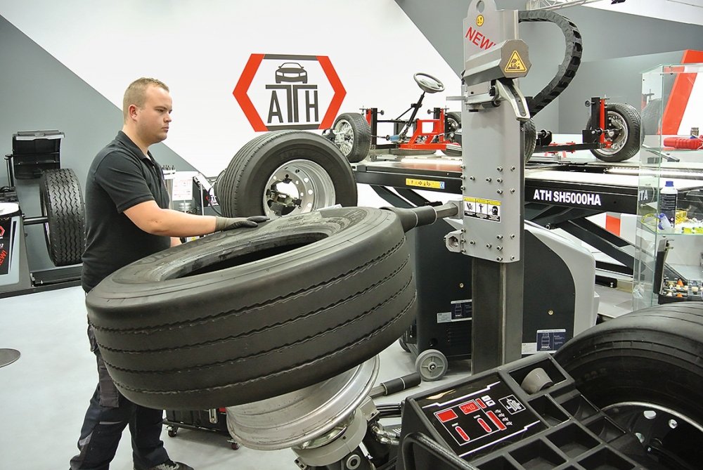 Mit der ‚ATH M126‘ hatte bei ATH-Heinl eine einfache, aber dennoch robuste Reifenmontiermaschine speziell für Speditionswerkstätten und Einsteiger ins Reifengeschäft Premiere. Bei ihr werden die Funktionen Heben, Senken, Spannen sowie die Drehbewegung der vier Spannklauen elektrohydraulisch gesteuert, was ein präzises und intuitives Arbeiten ermöglichen soll. Die für bis zu 26 Zoll große Lkw- und Busräder geeignete Maschine bietet zwei unterschiedliche Spannrollen und einen Montagearm, der sich manuell auf dem Schlitten schwenken lässt, die Winkelverstellung indes erfolgt hydraulisch.