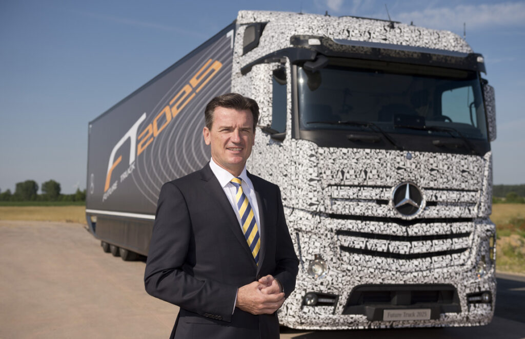 Wolfgang Bernhard, Vorstand der Daimler AG für Daimler Trucks & Daimler Buses: ‚Wenn die gesetzlichen Rahmenbedingungen für autonomes Fahren zügig geschaffen werden, ist eine Markteinführung des ‚Highway Pilot‘ Mitte des kommenden Jahrzehnts vorstellbar.‘