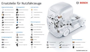 Der Geschäftsbereich Mobility Aftermarket (MA) der Robert Bosch GmbH bietet Handel und Nfz-Werkstätten weltweit Diagnose-, Prüf- und Werkstatttechnik sowie ein umfassendes Nfz-Ersatzteilsortiment – vom Neuteil über Austauschteile bis hin zur Reparaturlösung. Das Teile-Portfolio besteht aus Erzeugnissen der Bosch Erstausrüstung, aus eigenentwickelten und spezifisch für den Nfz-Aftermarket gefertigten Teilen. Hinzu kommen diverse Dienstleitungen für Nfz-Werkstätten. Über 17.000 Mitarbeiter und Mitarbeiterinnen sowie ein weltweiter Logistikverbund stellen sicher, dass die Ersatzteile schnell und termingerecht geliefert werden. Bosch Mobility Aftermarket ist auch verantwortlich für das Werkstattkonzept Alltrucks.