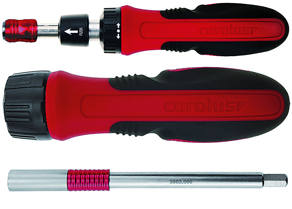 Die Variante "3802.000" verfügt ebenfalls über eine magnetische Bitaufnahme mit ¼-Zoll. Deren Fixierhülse hat den gleichen Außendurchmesser wie die Aufnahme und liegt im hinteren Bereich, was ein unbeabsichtigtes Entriegeln bei engen Verhältnissen vermeiden soll. Als serienmäßiges Zubehör legt Carolus diesem Knarren-Schraubendreher eine 135 Millimeter lange Einsteckklinge bei, welche sich auch für den Maschinenantrieb eignen soll.