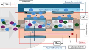 Zwei Elektroden bilden die Grundlage der Messzelle, eine für die Abgasseite, die andere für die Seite der Referenzluft. Aufgrund der unterschiedlichen Sauerstoffanteile entsteht zwischen beiden Elektroden eine für das Steuergerät messbare Spannung im Millivolt-Bereich. Gleichzeitig versucht das Steuergerät die Spannung auf einen Wert von 450 mV (λ =1) einzustellen, indem die Pumpzelle entsprechend angesteuert wird. Je nach Gemisch fördert die Pumpzelle Sauerstoff in die Messkammer oder leitet ihn ab. Die Stromrichtung in der Pumpzelle bestimmt die Förderrichtung des Sauerstoffs. Da die Stromaufnahme der Pumpzelle proportional zur Gemisch-Zusammensetzung ist, kann der dabei entstehende Pumpstrom als Maß für den Sauerstoffanteil im Abgas herangezogen werden. Durch die vorgeschaltete Breitbandlambdasonde wird der Sauerstoff im Abgas nahezu vollständig entfernt, sodass in die Sensorkammer-2 überwiegend Stickoxide und nur noch minimale Restsauerstoffmengen gelangen.