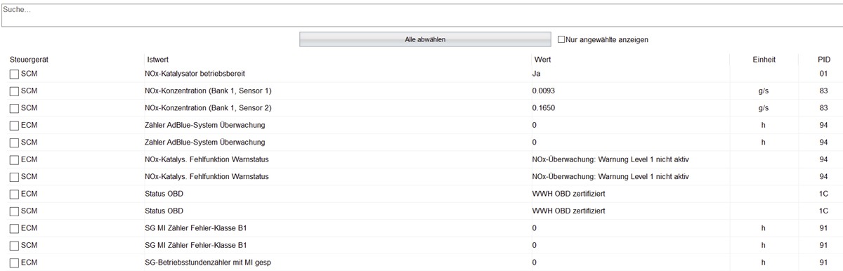Mit einem herkömmlichen Diagnosetester lassen sich beispielsweise die aktuellen NOₓ-Istwerte vor und nach dem SCR-Katalysator in Echtzeit auslesen. Dieser Abgleich eignet sich besonders, um mögliche Unstimmigkeiten zwischen den Messgrößen zu erkennen. Nur bei ausreichend hoher Abgastemperatur lassen sich diese korrekt auswerten, idealerweise unter Last im Fahrbetrieb.