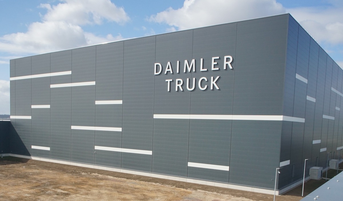 Drei Monate nach der Eröffnung des Daimler Truck Global Parts Centers (GPC) ziert nun auch das offizielle Unternehmenszeichen die Außenwände des GPC. Die Beschriftung in 35 Metern Höhe wiegt rund 120 kg. In der Dunkelheit sind die jeweils drei Meter großen Buchstaben mit LEDs beleuchtet.