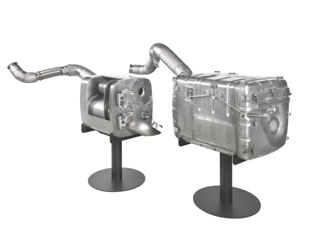 Leistungsfähiges Leichtgewicht: Mit der von Dinex entwickelten ‚Eminizer’-Technologie lassen sich Euro-VI-Abgasboxen (links) im Vergleich zu aktuellen Anlagen zwischen 20 bis 50 Prozent leichter und kleiner auslegen, da die SCR-Funktionalität in den DPF integriert wird. Bild: Dinex