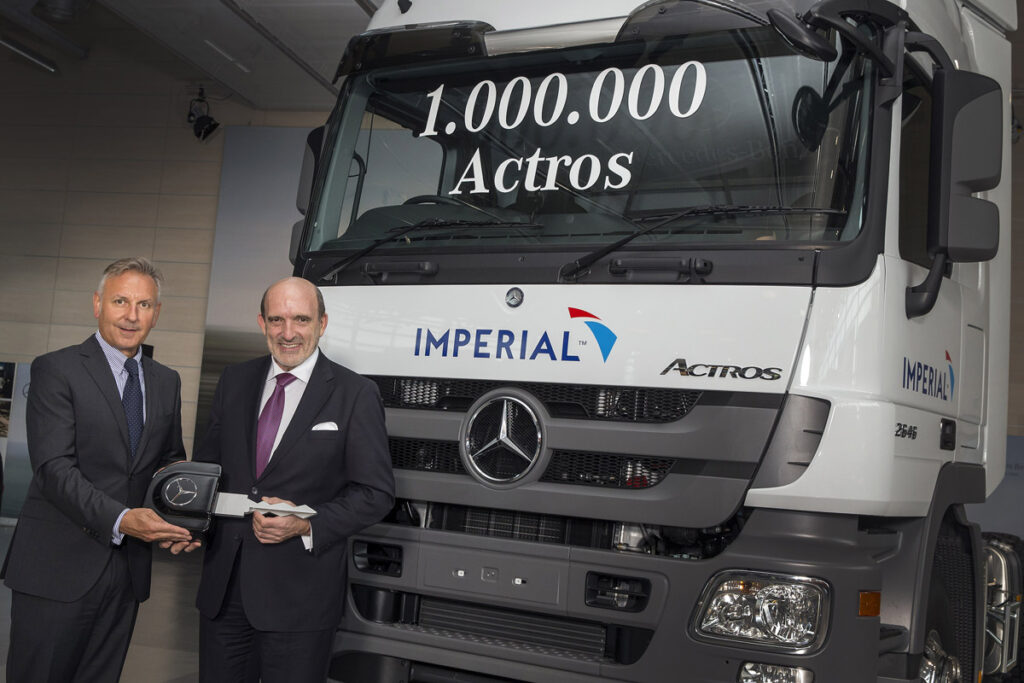 Im Beisein von Till Oberwörder, Leiter Vertrieb und Marketing Mercedes-Benz Lkw, und Gerald Jank, Leiter Mercedes-Benz Werk Wörth, überreichte Stefan Buchner, Leiter Mercedes-Benz Lkw, im Kundencenter des Wörther Produktionsstandortes symbolisch den Fahrzeugschlüssel des Jubiläumfahrzeugs an Mark Lamberti, CEO der in Südafrika beheimateten Imperial-Muttergesellschaft Imperial Holdings Ltd.