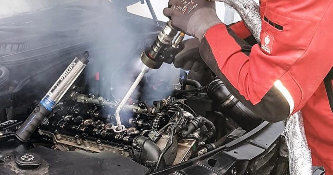 Doch Ronny Rogge, Chef des in Elsterwerda ansässigen und auf Dieselpartikelfilter- und Industrie-Reinigung spezialisierten Unternehmens Irosoft-Cleantech, kennt eine andere Lösung: Aufgrund seiner Erfahrung mit dem Trockeneisstrahlen bei Industrieprojekten empfiehlt der Reinigungsspezialist, die betroffenen Komponenten mit Hilfe von bis zu – 79 °C kaltem Trockeneis im Strahlverfahren zu säubern. Um auch in die letzten Ecken des noch montierten Zylinderkopfs und des verwinkelten Ansaugtrakts bis an die Ventile zu gelangen, verwendet der Reinigungsspezialist diverse Verlängerungen für die Düsen seines Trockeneis-Strahlgeräts. In unserem Beispiel entfernte ein Irosoft-Mitarbeiter damit mobil und direkt vor Ort in der Werkstatt die störenden Ablagerungen innerhalb von rund anderthalb Stunden und er reinigte bei dieser Gelegenheit auch gleich die gesamte Ansaugbrücke mit.