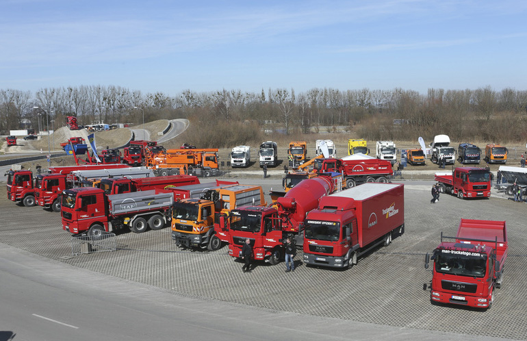Über 130 MAN TGL, TGM, TGS und TGX stehen für die Besucher aus den Bereichen Fernverkehr, Verteilerverkehr, Bau, Schwerlast sowie Feuerwehr und Landwirtschaft bereit. In Begleitung von MAN-Mitarbeitern können die Euro-6-Fahrzeuge auf der MAN-Teststrecke sowie auf einer Landstraßen- und Autobahnrunde Probe gefahren werden.