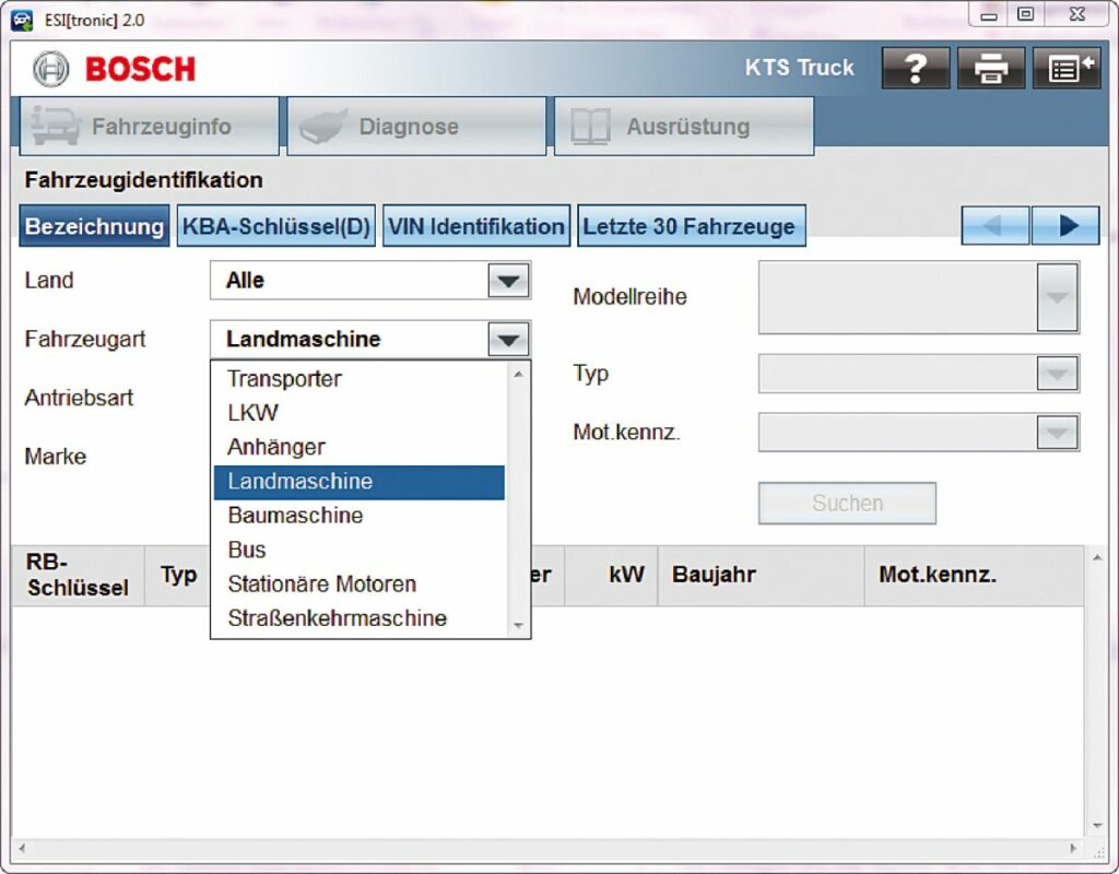 Seit dem Update ‚Esitronic 2017/3‘ lassen sich auch ‚Off-Highway‘-Fahrzeuge wie Land- und Baumaschinen sowie Stationärmotoren diagnostizieren. Bislang musste der ‚KTS Truck‘-Nutzer die aktuelle Anwendung allerdings über den sogenannten ‚Fahrzeugkonfigurator‘ zusammenstellen, der eine individuelle Auswahl gemäß dem Verbau-Zustand der Systeme in den einzelnen Maschinen und Motoren erlaubt. Mit dem anstehenden Update ‚Esitronic 2018/3‘ soll die ‚Off-Highway‘-Diagnose durch die dentifikation der Maschinen und Motoren nach Fahrzeugart, Antriebsart, Marke, Modell et cetera, ergänzt werden. Angeboten wird diese ‚Off-Highway‘-Diagnose‘ als zwei neue Infoarten der Esitronic 2.0: ‚Off-Highway 1‘ (OHW 1) für Landmaschinen und ‚Off-Highway 2‘ (OHW 2) für Baumaschinen und Stationärmotoren. Laut Bosch deckt die ‚OHW 1‘ 40 Marken und die ‚OHW 2‘ 75 Marken ab.