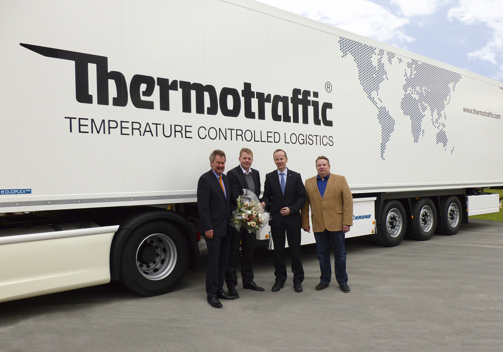 Krone-Regional-Vertriebsleiter Helmut Blanke und Vertriebsleiter Dr. Frank Albers bedankten sich anlässlich der Fahrzeugübergabe für das Vertrauen in Krone-Technik. ‚Wir freuen uns sehr, dass die akribische Marktanalyse von Thermotraffic zu Gunsten des Krone-‚Cool Liners‘ ausgefallen ist und bedanken uns im Namen des gesamten Krone-Teams.‘