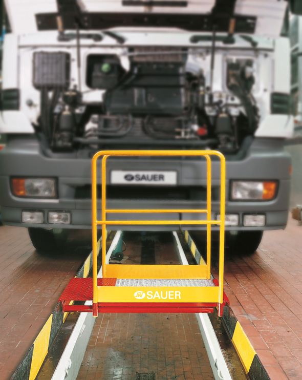 Um Arbeitsgruben sicher und komfortabel überqueren zu können, empfiehlt sich eine Grubenbrücke. Eine mit 400 kg Traglast und Sicherheitsgeländer insbesondere für Nutzfahrzeugwerkstätten hat Sauer im Portfolio.