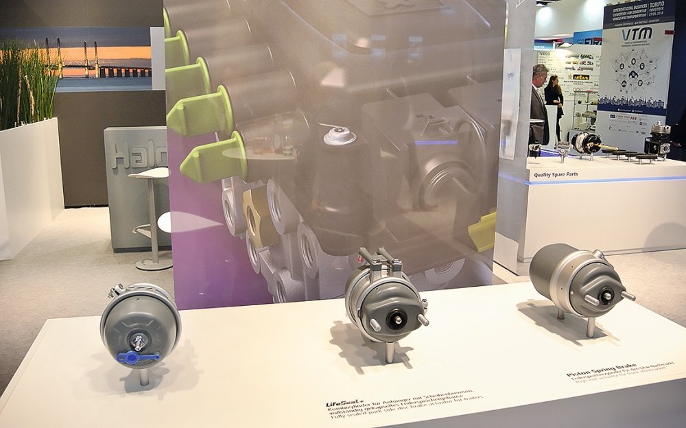 Unter dem Leitmotiv „A world of safer vehicles” zeigte der schwedische Bremssystemspezialist Haldex seine neuen Doppelmembran-Federspeicherbremszylinder ‚LifeSeal+‘ (Bildmitte). Nach eigenem Bekunden wurden diese für die zukünftigen Anforderungen von Trailern entwickelt. Zu den charakteristischen Merkmalen gehören unter anderem ein vollständig gekapseltes Gehäuse sowie eine berührungsfreie Druckfeder. Außerdem sollen sie die Einbauzeit in der Produktion verkürzen, da sie sich einfach und schnell und ohne lose Teile montieren lassen sollen. Zusätzlich präsentierte Haldex weitere Brems- und Federspeicherbremszylinder, darunter die neue 16/24-Version der bewährten ‚BlueSeal‘-Bremszylinderserie sowie Varianten der Zweitmarke ‚Grau‘.