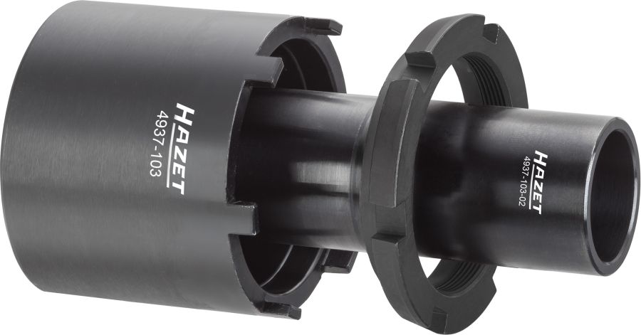 Mit der Produktnummer 4937-101/4 beispielsweise erhält der Werkstattprofi einen Zapfenschlüssel-Satz für verschiedene Lkw-Modelle von Mercedes-Benz. Damit sind laut Hazet Reparatur- und Wartungsarbeiten an Radnaben, Radlagern und Bremsscheiben der Vorder- und Hinterachse möglich. Zu dem Satz gehören unter anderem ein Zapfenschlüssel mit zwölf, 11,4 mm breiten Zapfen und einem Werkzeug-Innendurchmesser von 101,5 mm sowie drei auswechselbare Führungsrohre.