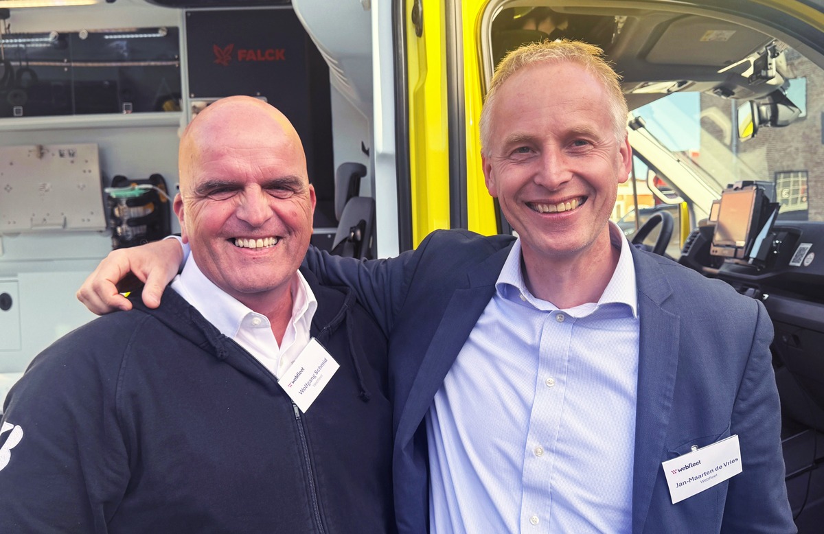 Wolfgang Schmid (links), Head of Central Region bei Webfleet und Jan-Maarten de Vries, President Fleet Management Solutions bei Bridgestone, auf dem Betriebsgelände von Falck in Kolding/Dänemark.