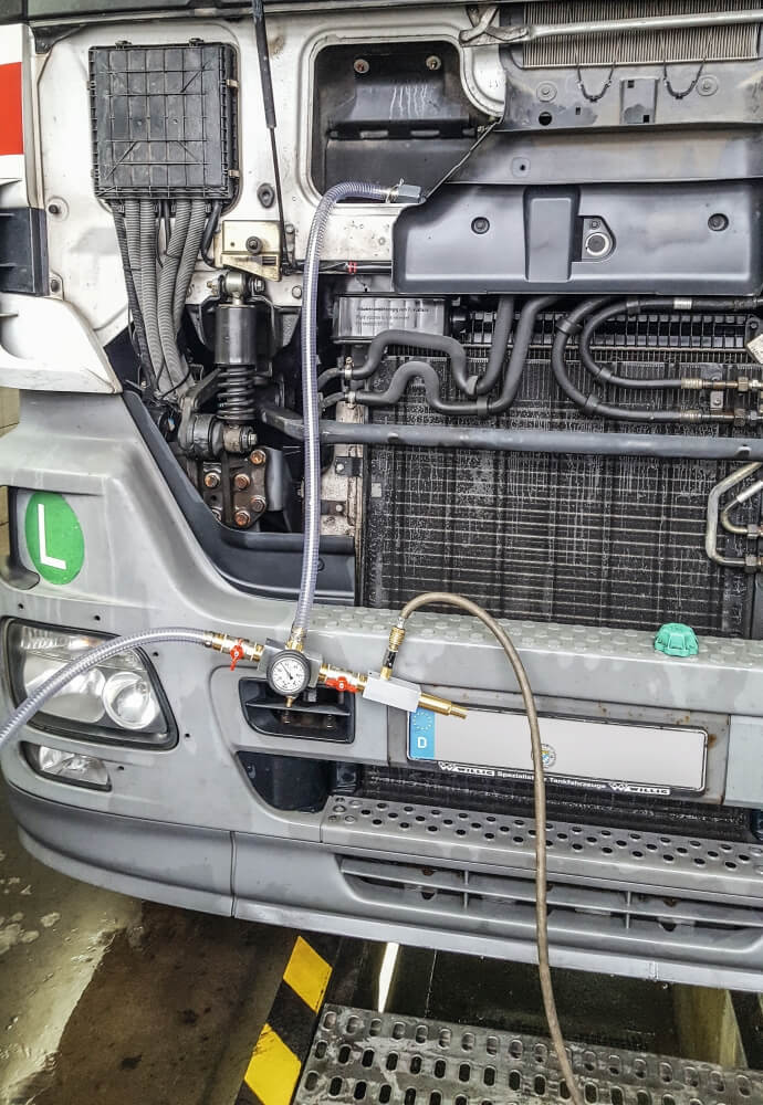 Nach Motorreparaturen, oder wenn turnusmäßig das Kühlmittel zu ersetzen ist, muss abschließend das Kühl- und Heizungssystem fachgerecht entlüftet werden. Bei manchen Nutzfahrzeugmodellen kann sich dies zur Sisyphus-Arbeit ausarten, weil sich das System mit herkömmlichen Methoden nicht vollständig blasenfrei entlüften lässt, was später im Fahrbetrieb zu Problemen führen kann. Um dies zu vermeiden, empfiehlt AutotestgeräteSpezialist Leitenberger ein Kühler-Vakuum-Befüllgerät (KVB), da dieses sowohl bei der Erstbefüllung als auch im Reparaturfall ein schnelles und vor allem blasenfreies Befüllen ohne langwieriges Nach-Entlüften gewährleisten soll.