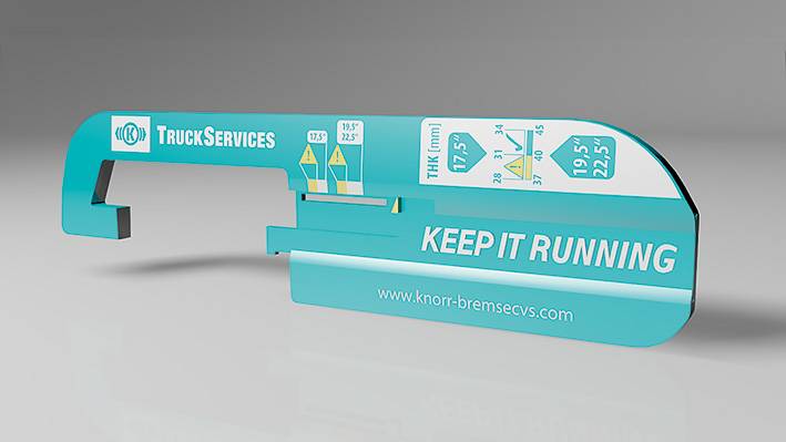 Werkstattfachleute indes erhalten über ,TruckServices‘ Unterstützung in Form mechanischer und elektronischer Spezialwerkzeuge, damit sie fachgerecht mit der immer komplexer werdenden Nutzfahrzeugtechnik umgehen und Service- und Wartungsarbeiten, Reparaturen oder Ersatzaktionen daran fachgerecht und professionell erledigen können. Ein Beispiel hierfür ist die Scheibenbrems-Lehre, die aufgrund ihrer Pfiffigkeit eine hohe Akzeptanz bei Bremsenprofis genießt. Den Fachleuten von Knorr-Bremse zufolge lässt sich mit dem Tool bei der Bremseninspektion die Restdicke der Bremsscheiben schnell und zuverlässig abschätzen, ohne das Rad abnehmen zu müssen. Mit ihr soll sich auf simple Weise feststellen lassen, ob ein Bremsscheibenwechsel nötig oder eine genauere Messung mit der Schieblehre notwendig ist. Das Tool eignet sich sowohl für Bremsen mit 19,5 und 22,5 Zoll sowie für 17,5-Zoll-Varianten und besitzt jeweils zwei leicht verständliche Anzeigebereiche – "OK" und "Bitte genauer prüfen" (mit der Schieblehre).