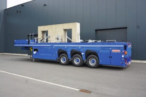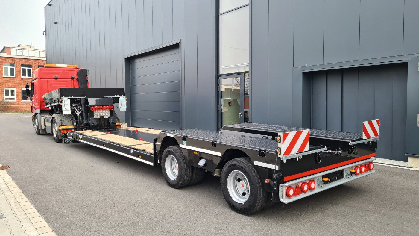 Tiefbett-Auflieger SATAHV mit abfahrbarem Schwanenhals, teleskopierbar. Das Fahrzeug ist als Drei– oder Vier-Achser erhältlich.
