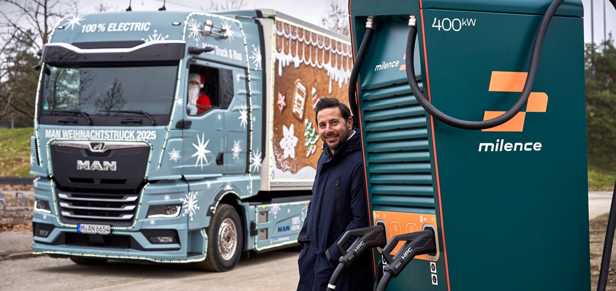 Seit 20 Jahren bringt der festlich geschmückte MAN-Weihnachtstruck Freude in die Adventszeit – in diesem Jahr erstmals vollelektrisch. Basis ist ein MAN eTGX mit sechs Batteriepacks und bis zu 570 Kilometern Reichweite. Zehn Auszubildende aus dem Werk München haben den eTruck in sechs Wochen liebevoll dekoriert: Rund 150 Meter LED-Lichterkette, goldene Akzente und ein strahlendes MAN-Logo machen ihn zum ‚elektrischen Schlitten‘ der besonderen Art.