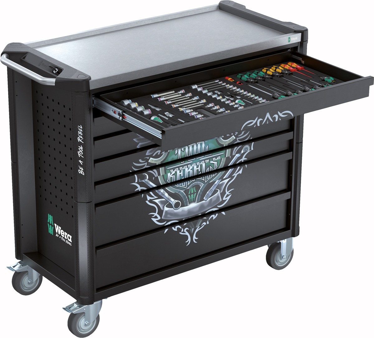 Der Wuppertaler Werkzeugspezialist Wera hat mit vier neuen Werkstattwagen sein Sortiment erweitert. Die in zwei Varianten und je zwei Größen erhältlichen Wagen verfügen über eine große Ablage- und Arbeitsfläche aus Edelstahl. Der abgedichtete Aufbau schützt das Wageninnere vor Flüssigkeiten. Fünf flache und zwei hohe Schubladen auf kugelgelagerten Teleskopschienen mit Auszugschutz ermöglichen eine strukturierte Organisation von Werkzeug und Material. Eine verschweißte, doppelwandige Konstruktion sowie ein Kantenschutz mit integrierten Dämpfern an allen vier Ecken sorgen laut Wera für hohe Stabilität im rauen Werkstattalltag. Je nach Modell sind die neuen Werkstattwagen mit sechs bis acht Schaumstoffeinlagen ausgestattet. Die Einlagen sind frei von chemischen Ausdünstungen.