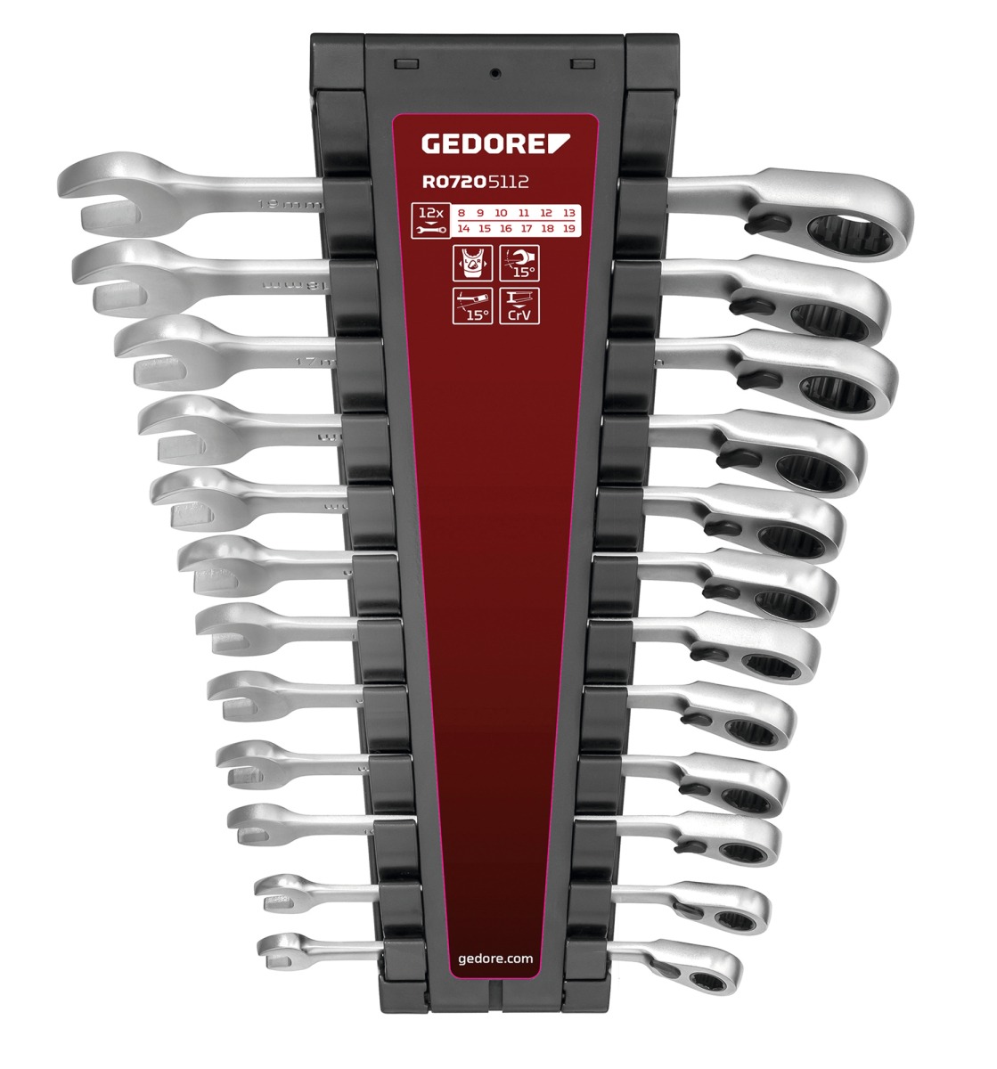 Gedore red hat einen sechs- und einen zwölfteiligen Ringratschen-Maulschlüsseln-Satz vorgestellt. Der kleine Satz umfasst die Schlüsselweiten 8, 10, 12, 13, 17 und 19 mm, beim größeren kommen die Größen 9, 11, 14, 15, 16 und 18 mm hinzu.
