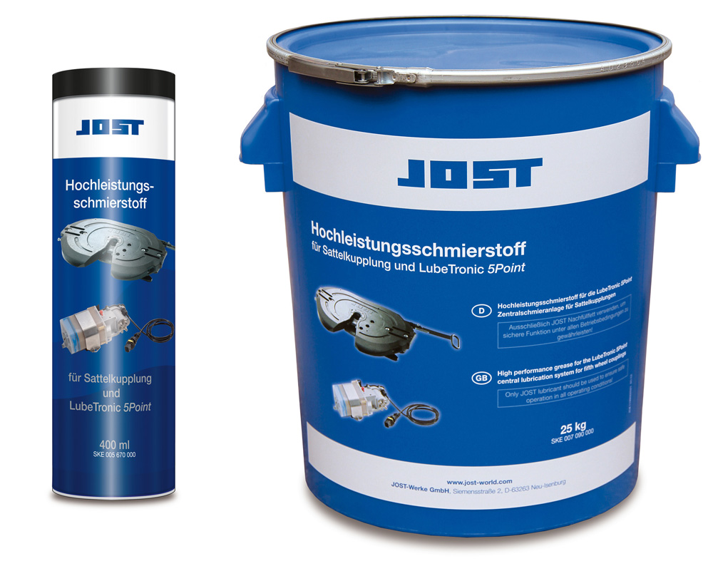 Das Spezialfett ist für den Einsatz in dem automatischen Schmiersystem geprüft und soll eine optimale Schmierung gewährleisten, eine zuverlässige Dosierung sowie einen geringen Verschleiß. Der Jost-Hochleistungsschmierstoff ist laut Anbieter temperaturbeständig, haftet gut an allen Metalloberflächen und eignet sich daher auch für die manuelle Schmierung von Sattelkupplungen.