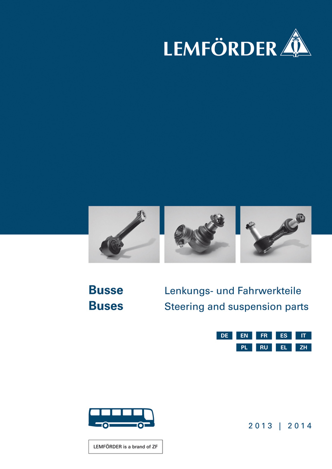 ‚Busse – Lenkungs- und Fahrwerkteile 2013/2014’ heißt der aktuelle Lemförder-Katalog von ZF Services (www.zf.com), der das komplette Produktspektrum für Busse erstmals in einem Kompendium zusammenfasst. Die insgesamt 613 Referenzen sind in dem 571 Seiten starkem Nachschlagewerk übersichtlich dargestellt und sollen sich dank der detaillierten Produktabbildungen auch leicht identifizieren lassen.