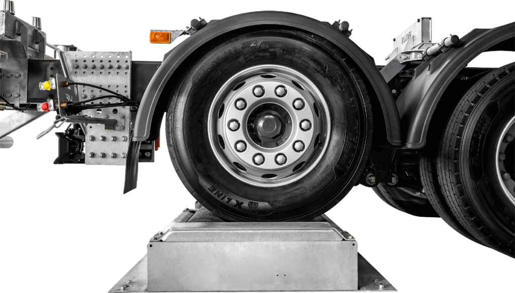 Erkennt der Bediener am Prüfstraßenmonitor, dass der Mindestdruck nicht erreicht wird, fährt er von der Fahrerkabine per Knopfdruck die Hydraulik aus und hebt die zu prüfende Achse an. Die Achslasterhöhung ergibt sich dann durch die Entlastung der restlichen Achsen. Der Druckanstieg wird dabei von den Druckaufnehmern automatisch erfasst. Die hydraulische Lastsimulation ist im Rollengehäuse integriert und hebt die betreffende Achse um bis zu 200 Millimeter an. Hier geht’s zum Video.